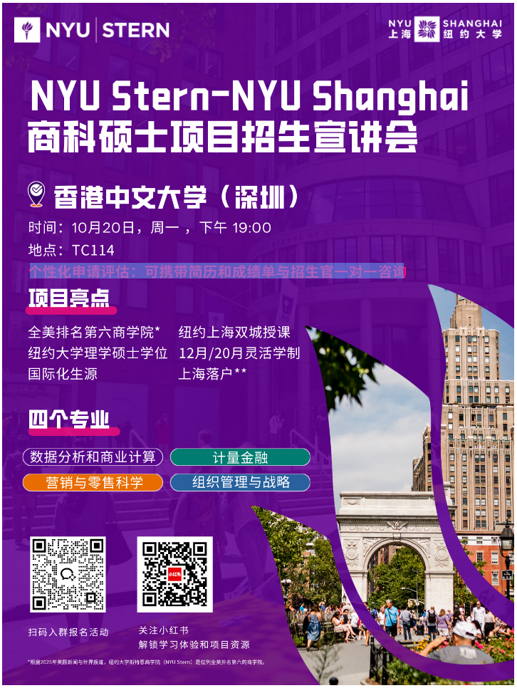 In this event, NYU Stern-NYU Shanghai Admission Team will share the master's program. Attendants will have opportunity of pre-evaluation of application. Please bring CV and transcript for the 1:1 evaluation session.